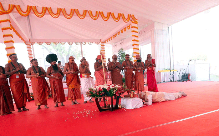 NEW DELHI 28, Jymmang (PIB): U Myntri Rangbah duh ka ri, u Narendra Modi u la aiti ia ka iing dorbar thawain Parliament ba thymmai sha ka ri mynta ka sngi. Ha kane ka sngi, u Myntri Rangbah duh u la buh ia ka Sengol bad Nandi hajrong kaba phai shaphang ka bynta mihngi-sepngi ha iing dorbar thawain Parliament ba thymmai. U la pynmeh ruh ia i sharak bad buh syntiew ha ka Sengol.