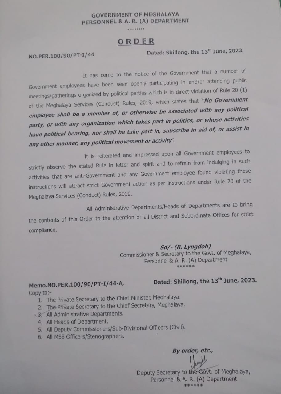 Ha ka jingpynbna kaba pynmih mynta ka sngi, ka Commissioner & Secretary to the Govt. of Meghalaya, Personnel & A. R. (A) Department, ka kong Ripnar Lyngdoh ka la ong ba ka la ioh jingtip ba ki don shibun ki nongtrei sorkar kiba la iashim bynta pyllein pyllein ha ki jingialang paidbah, ki jingialum paidbah ba la pynlong ki seng sain pyrthei kaba long ka jingpynkhein ia ka Rule 20 (1) jong ka Meghalaya Services (Conduct) Rules, 2019, kaba ong, “Ki nongtrei sorkar kim dei ki dkhot ne pyniasoh bad kano kano ka seng sain pyrthei lane kano kano ka seng kaba iashim bynta ha ka politik lane ki kam kiba iadei bad ka sain pyrthei ne ban iashim bynta ne ban iarap ne kyrshan ha kano kano ka rukom ia kano kano ka seng sain pyrthei”.