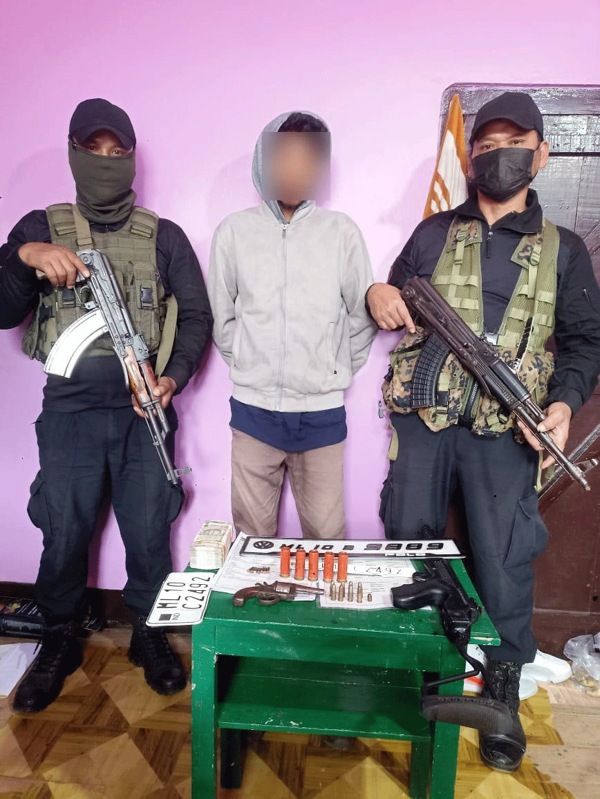 SHILLONG 16, Jylliew: Ki pulit ka East Khasi Hills jong ka ANTF ryngkat ki pulit na Rynjah bad Laitumkhrah Police Station kila ioh kurup kawei ka pistol, 7 tylli round ki kuli 0.22, 6 round ki kuli .38, uwei u kuli ba la pyndonkam, 5 round ki 12 bore ammunition, kawei ka mobile phone, ka pisa 2 lak tyngka bad kawei ka suloi lyer, 4 tylli ki kali kynthup ar tylli ka Mahindra Thar, kawei ka Maruti Zen, kawei ka Maruti 800 bad kawei ka Chevrolet Beat na Mawpat mynta ka 16 tarik Jylliew 2023.