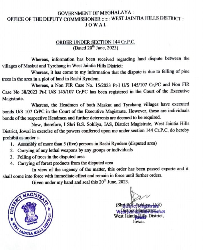 SHILLONG 22, Jylliew: U Deputy Commissioner ka West Jaintia Hills u la hap ban pynjari da ka kyndon Code of Criminal Procedure (Cr.PC) jong ka kyndon 144 ha jaka kaba khot ka Rashi Ryndem hadien ba ki ar tylli ki shnong, ka Maskut bad ka Tyrchang kila iakajia na ka jingiaknieh na ka jingpynkhyllem ia ki dieng kseh.