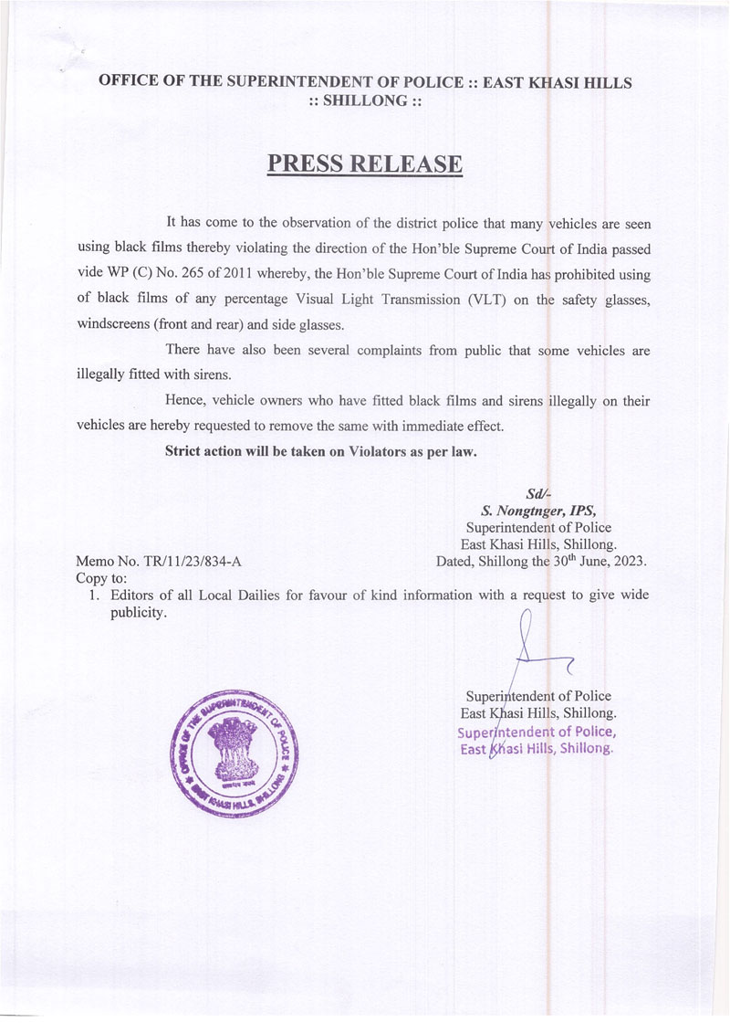 SHILLONG 30, Jylliew: U Superintendent of Police ka East Khasi Hills u la pyntip ba kito kiba tah ïing iong bad buh jingpah beain ha ki kali, ki dei ban weng noh mardor bad lada kim leh, ki pulit kin pyntreikam da ka ain pyrshah ia ki.
