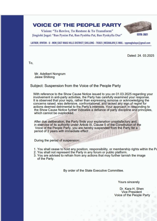 Shillong: Ka seng Voice of the People Party (VPP) ka la sospen ia u MLA ka North Shillong bah Adelbert Nongrum bad saw ngut kiwei pat haduh lai snem kynthih halor ka nongrim ba ki ialeh pyrshah bad tam sneng ia ka party.