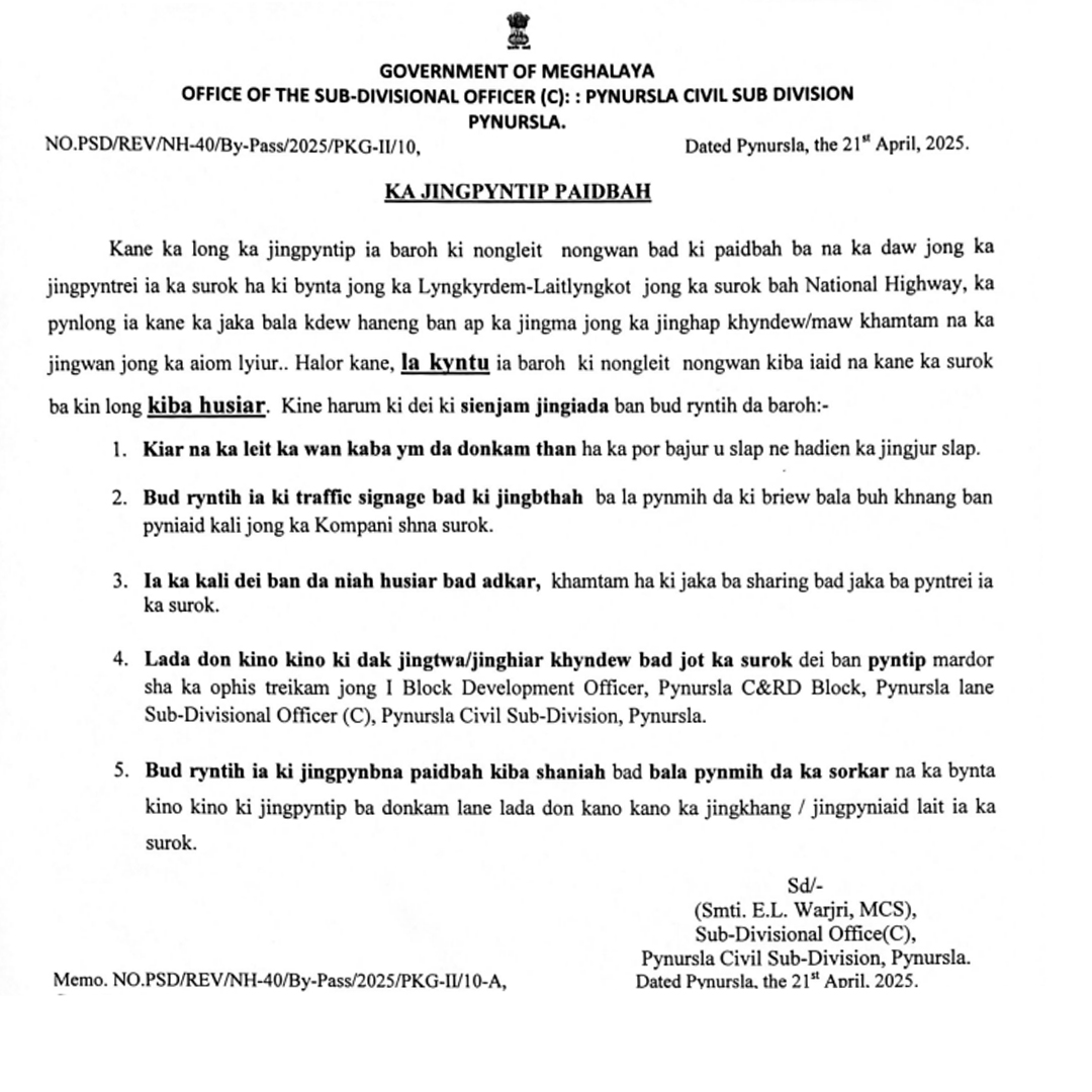Shillong: Ka SDO Pynursla Civil Sub-Division ka Kong EL Warjri kala pynbna paidbah mynta ka 21 tarik Iaiong 2025, ba kan don ka jingshna surok ha ka bynta kaba hap ha ka 24 km harum Laitlyngkot bad ha ka 37km hajan Lyngkyrdem da ka kompeni.