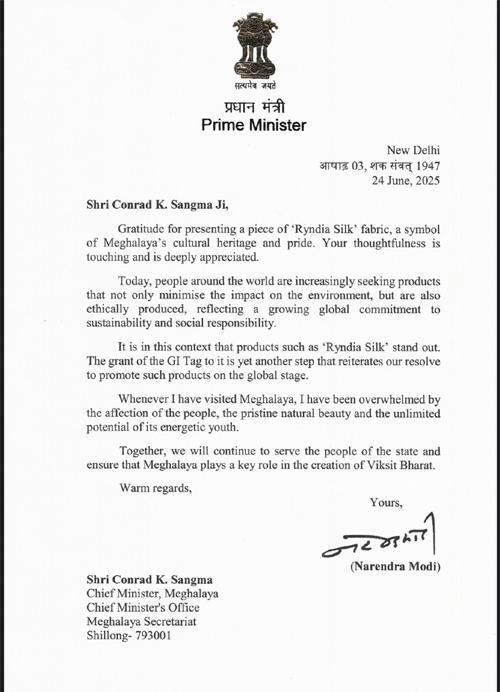Shillong: U Myntri Rangbahduh ka ri u Narendra Modi ula iaroh tyngeh ia ka jain ryndi kaba la ai sngewbha da u Myntri Rangbah ka jylla u Conrad K Sangma. Ha ka shithi kaba la phah sha u Conrad, u Modi ula ong ba ka jain ryndi ka Meghalaya ka pyni ia ka jingriew spah jong ka jylla ha ka riti dustur, kaba dei ka jingsarong.