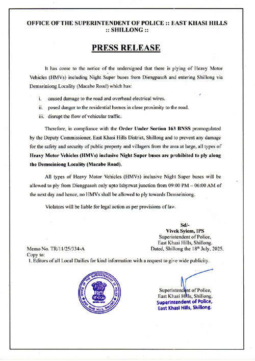 Shillong: U Superintendent of Police (SP) ka East Khasi Hills u bah Vivek Syiem ula pyntip ba katkum ka jingpynjari kyndon 163 BNSS ka bor district, ki kali heh naduh ki trok, ki Nigh Super ki lah ban rung na Diengpasoh tang haduh Itshyrwat.