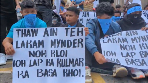 Ha ka jingshong kyrain mynta ka sngi, ka 18 tarik Nailar 2025, ki dkhot ka KSU ryngkat ki placard kiba la pynpaw ba ka la donkam mardor ia ka sorkar India ban tehlakam noh ia ka jingwan rung buhai shnong ki mynder sha kane ka thain bad ka jylla.