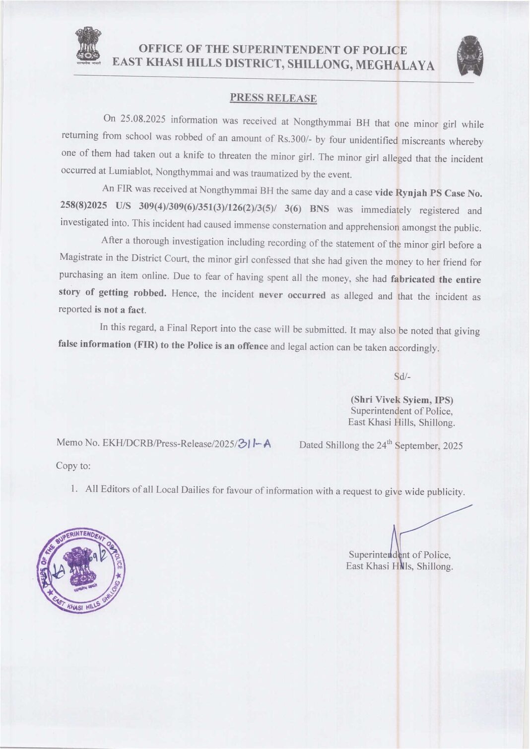 Ha ka kyrwoh u Superintendent of Police ka East Khasi Hills, bah Vivek Syiem mynta ka sngi, ula ong ba katei ka khynnah ka la phla ha u nongbishar ka District Court ba ka la thok bad shna khana ïa katei ka jingjia namar ba ka la ai ïa ka pisa T.300 ha u paralok ban pynthied tiar online, bad namar ba ka sheptieng ioh ba un pynlut baroh ka pisa, ka la shu thaw khana ba ka shah lute.
