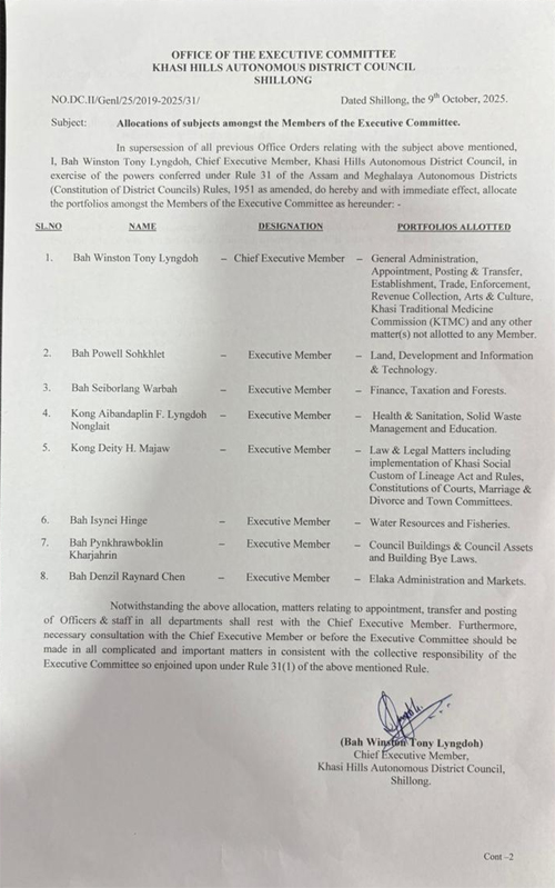 Shillong: U CEM ka KHADC u bah Winston Tony Lyngdoh ula bate kam ia ki Executive Member thymmai ka KHADC mynta ka sngi hadien ba la ioh ia ka jingmynjur na u Lat ka jylla u CH Vijayashankar ha ka 7 tarik mynta u bnai.
