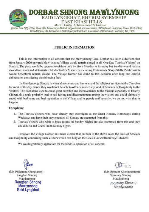 Shillong: Ka dorbar shnong Mawlynnong, ka la pynbna paidbah ba ka la shim ia ka rai ba naduh u Kyllalyngkot 2026 ter ter, kan khang noh ia baroh man ka sngi Robibar ne sngi u Blei ia kiba wan kai ne tourist.