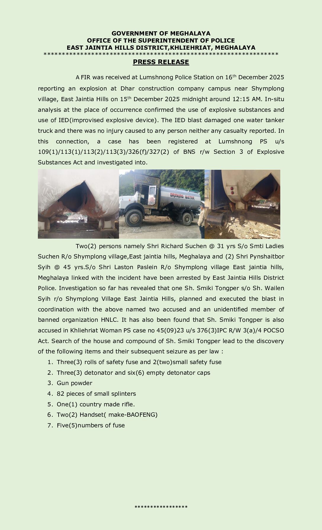 Shillong: Ki pulit ka East Jaintia Hills kila ioh kem 2 ngut ki briew halor ka jingbthei bom IED ha Dhar Company ha shnong Shymphlong, East Jaintia Hills ha ka shiteng miet ka 15 tarik Nohprah 2025.