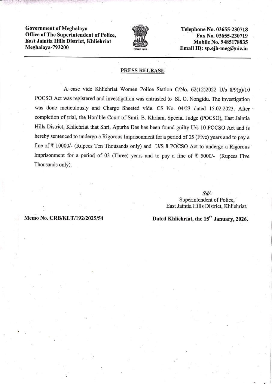 Shillong: Ka Kashari POCSO ka nongbishar B. Khriam ka East Jaintia Hills, Khliehriat ka la rai pynrem ia u Apurba Das halor ka jingthombor ia ka khynnah rit ha u snem 2022.