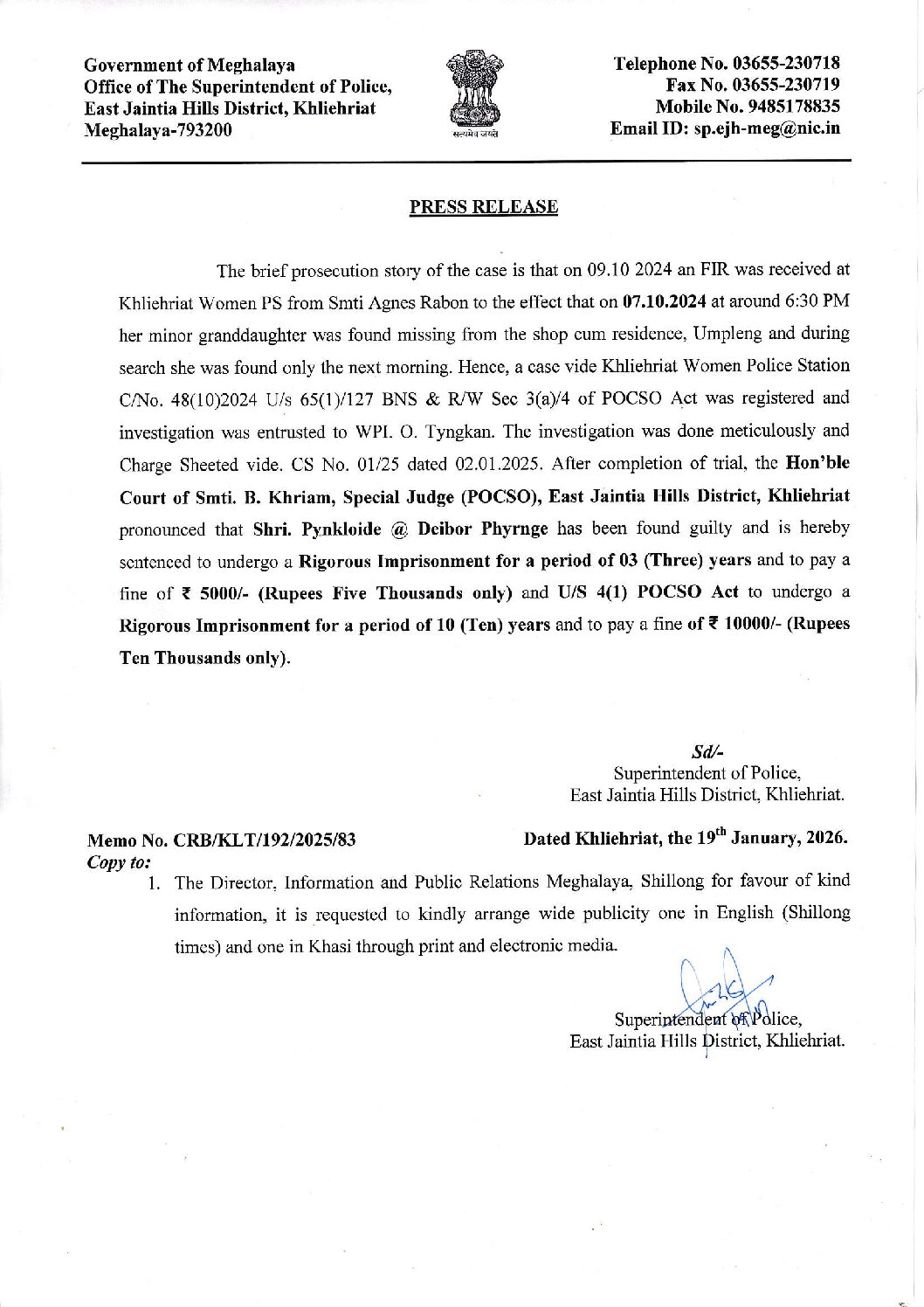 U SP ka East Jaintia ha ka kyrwoh ula ong ba halor kane ka jingjia, ki pulit kila rejister ha ka ain bad hapoh ka jingtohkit ka WPI. O. Tyngkan, la pynngat ia u Pynkloide uba khot sin kum u Deibor Phyrnge ha ka ain POCSO Act ha u 2025.