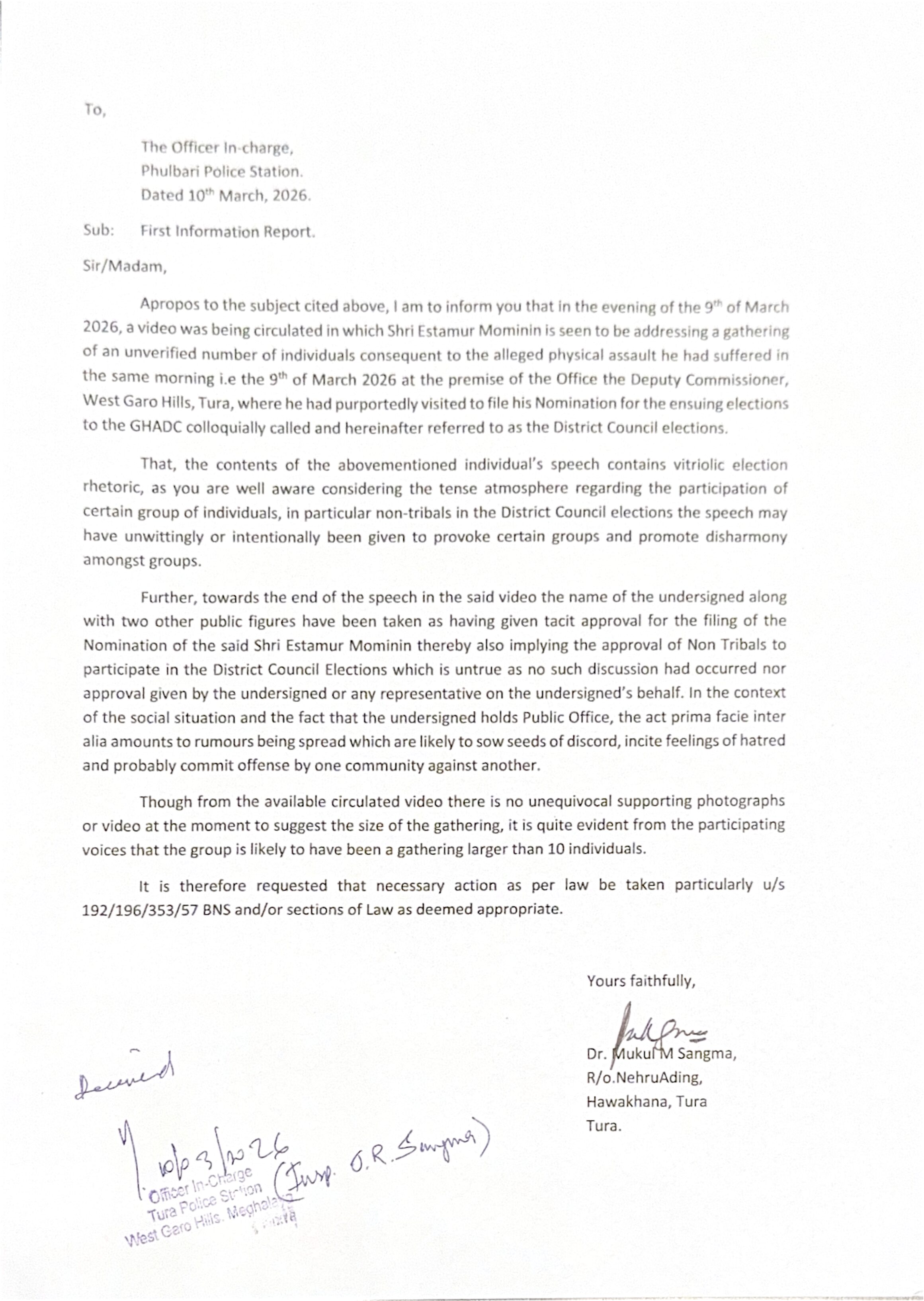 U Mukul ula kyntu ia ki Pulit ba kin leh eiei kat kum ka kyndon 192,196, 353 bad 57 jong ka Bharatiya Nyaya Sanhita lane kino kino ki kyndon kiba sngew iahap.