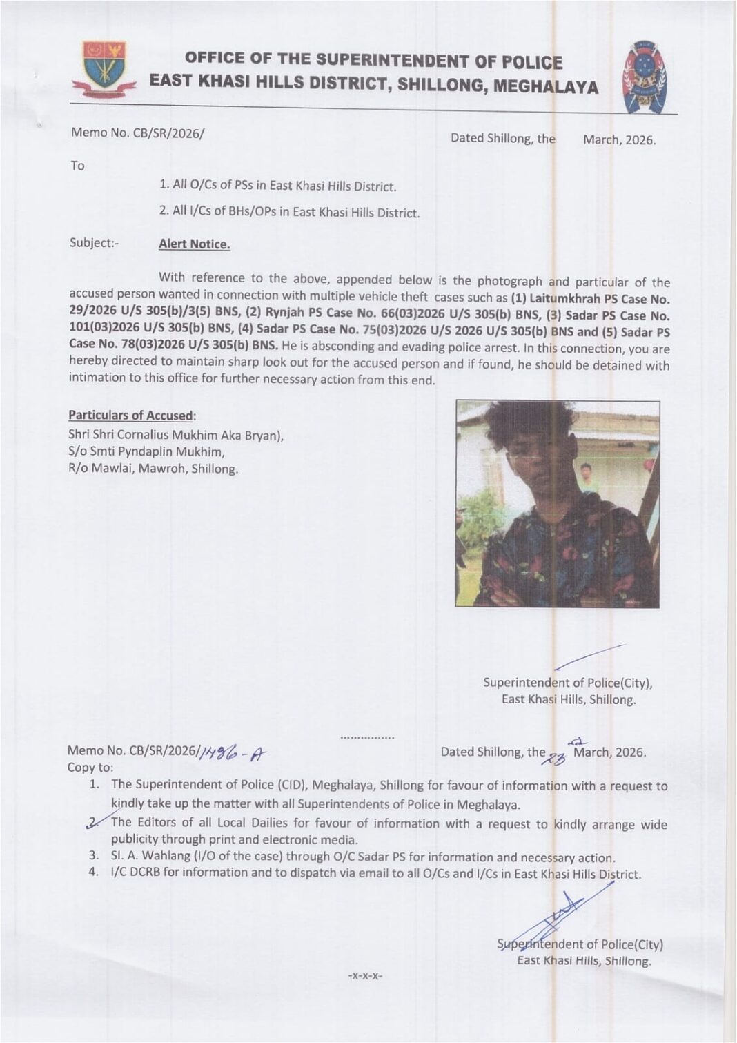 Shillong: Ki pulit ka East Khasi Hills kila pynbna iar sha baroh ki tnad pulit ba kin sngewbha ban pyntip mardor lada ki iohi ne lap ia u Cornalius Mukhim Aka Aryan.