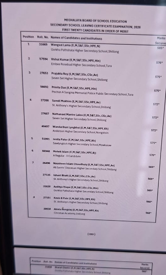 U Wangaal Lama na Gorkha Pathshala Higher Secondary School,Shillong ula wan ba nyngkong da kaba kamai 585 mark, bud sa u Vishal Kumar 576 mark na Embee Rosebud Higher Secondary School,Tura, nangta sa ka Prajukta Roy na Seven Set Higher Secondary School,Shillong bad ka Prinita Das kaba ioh mar 575 mark na Pechon A Sangma Memorial Police Public Secondary School,Tura.
