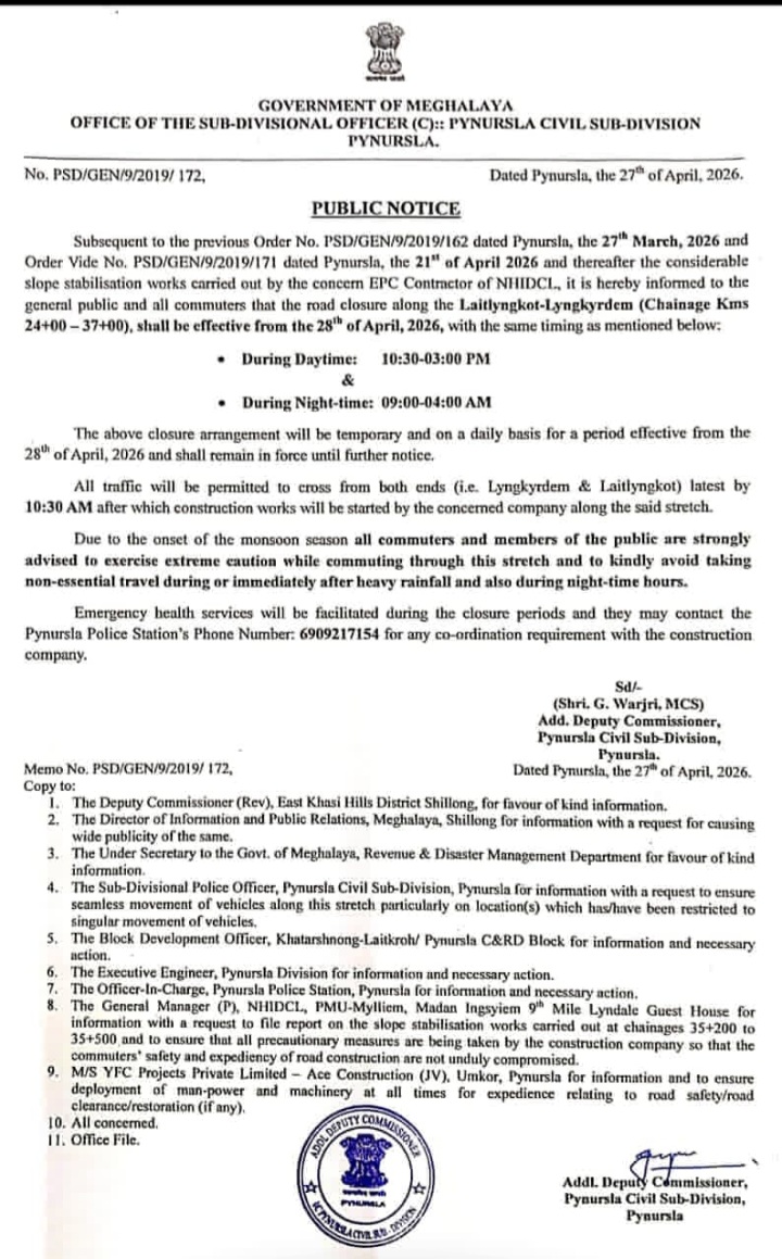 Shillong: U SDO Civil Pynursla ula pyllait ban iaid kali sha Pynursla hadien ba la khang iaid kali la 8 sngi kynthih.